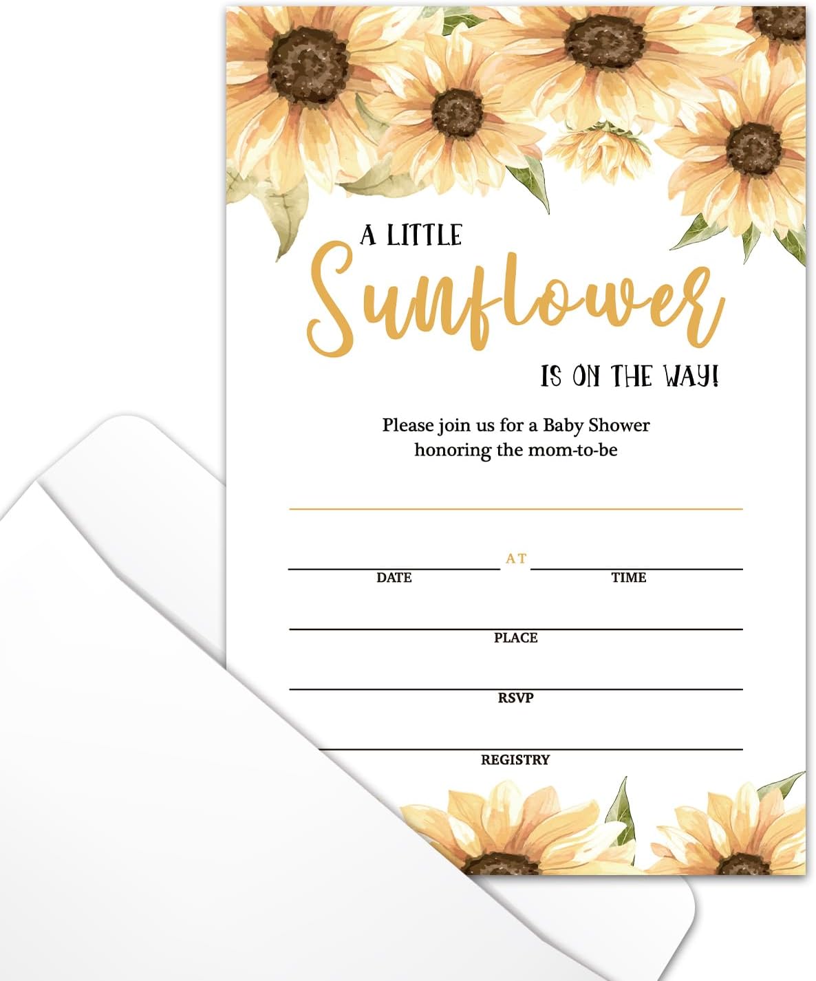 Are you expecting a new addition to your family and planning a baby shower party to celebrate the occasion? Look no further than these adorable Sunflower Baby Shower Party Invitations with Envelopes Set of 25. With a sunflower theme, double-sided fill-in invites, and envelopes included, these party supplies are the perfect way to announce your gender reveal baby announcement and get your party started!